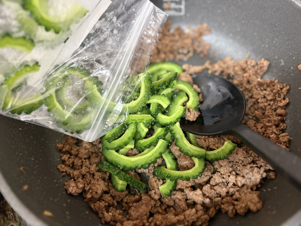 丸ごと凍らせたゴーヤは、軽く水にくぐらせるだけで包丁が入りやすくなり、スムーズに切り分けられます。縦半分に割れば中のワタも簡単に取り除け、事前に全解凍する必要がありません。丸ごと冷凍してもすぐに調理に取り掛かれます。ただ、塩もみや下茹でなどをしていないのでゴーヤ特有の苦味が残ります。