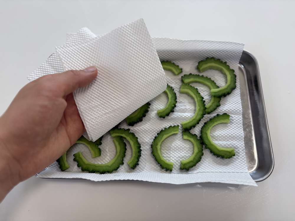 1.薄切りにしたゴーヤに1本あたり小さじ1杯の塩を振り、手でよくもみ込む