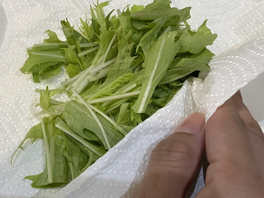 1.洗わずにキッチンペーパーか新聞紙、またはその両方で水菜全体を包む