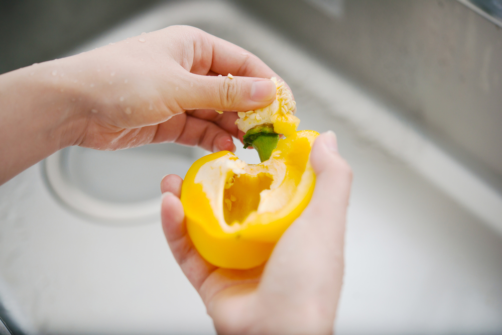 3.パプリカ内部にある種や白いワタ、頭側にあるヘタを取り除く