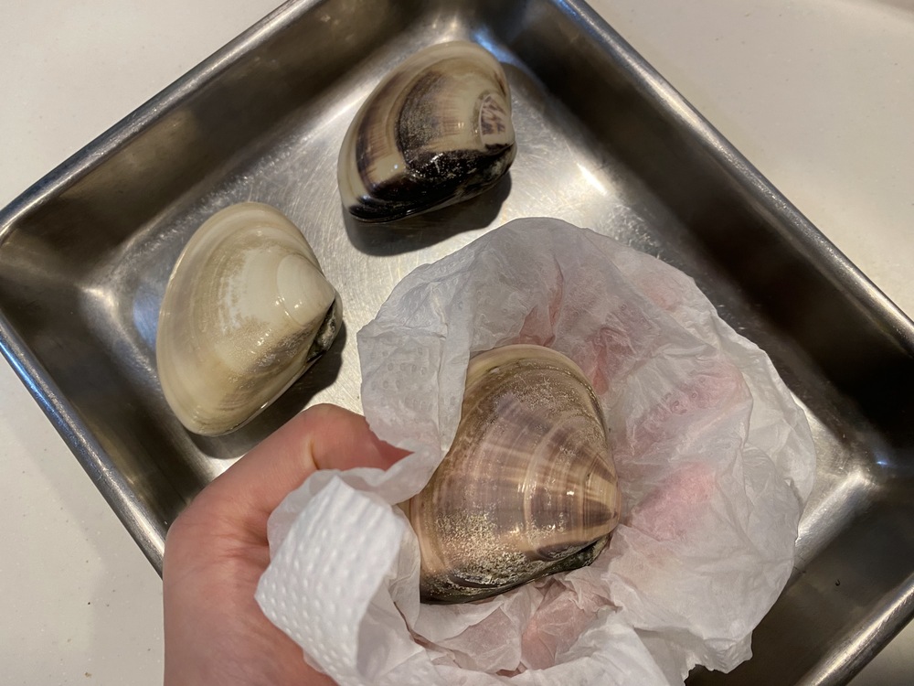 3.キッチンペーパーではまぐりの水気を拭き取る