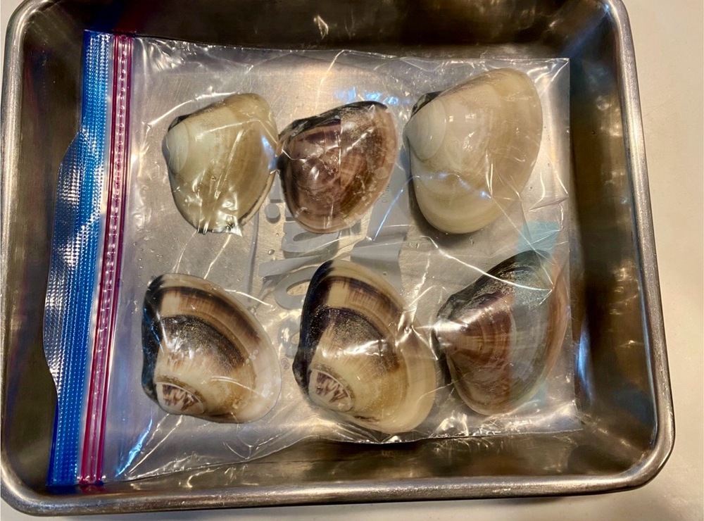 4.密閉袋にはまぐりを重ならないように入れて、金属製バットに乗せる