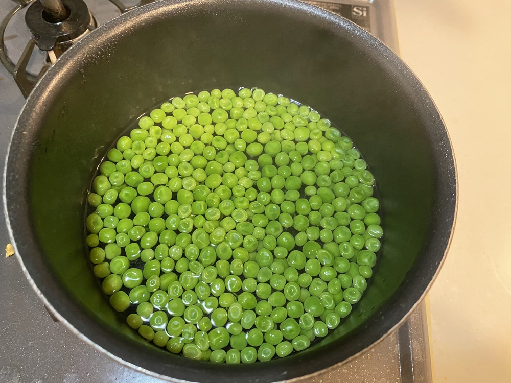 2.鍋にたっぷりの湯を沸かし、塩を入れてグリーンピースを1分程茹でる