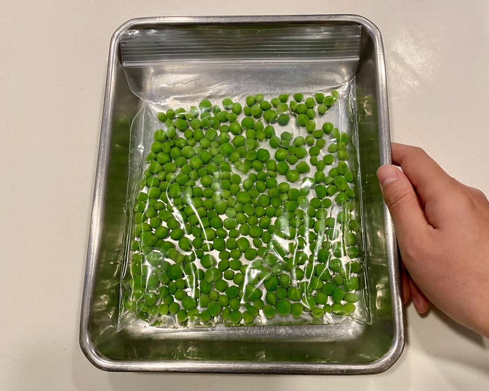 2.グリーンピースをそのまま密閉袋に入れて、平らにならす