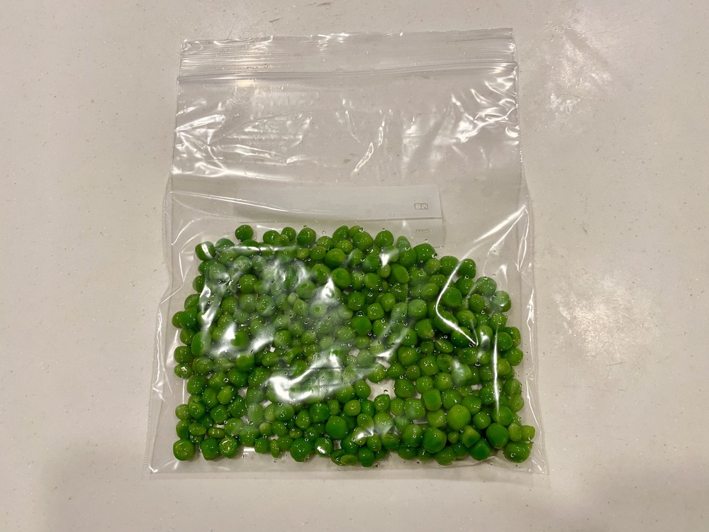 5.グリーンピースを密閉袋に入れて、空気を抜いて閉じる