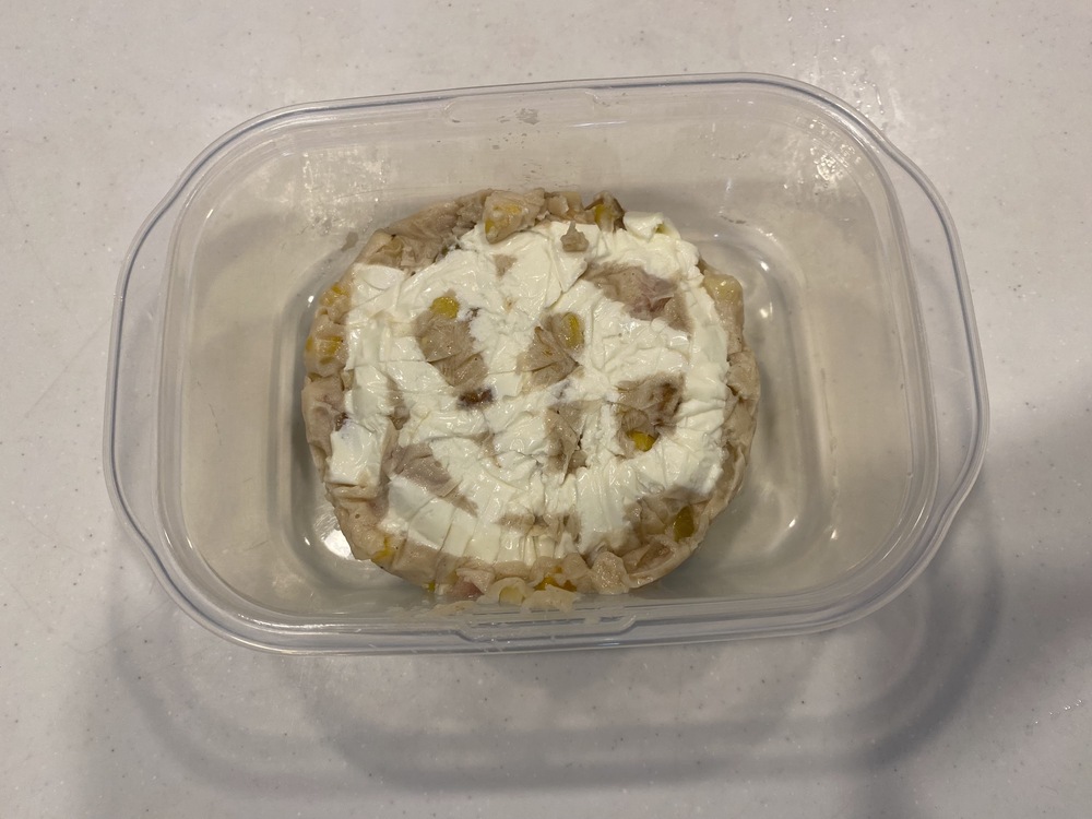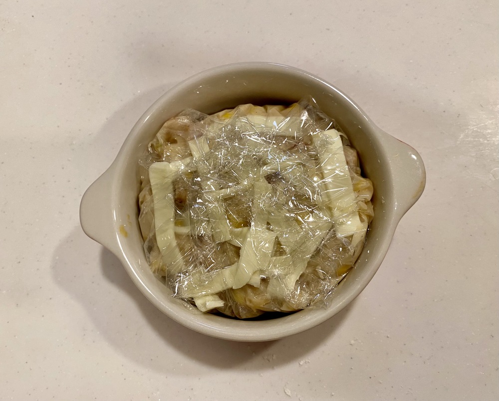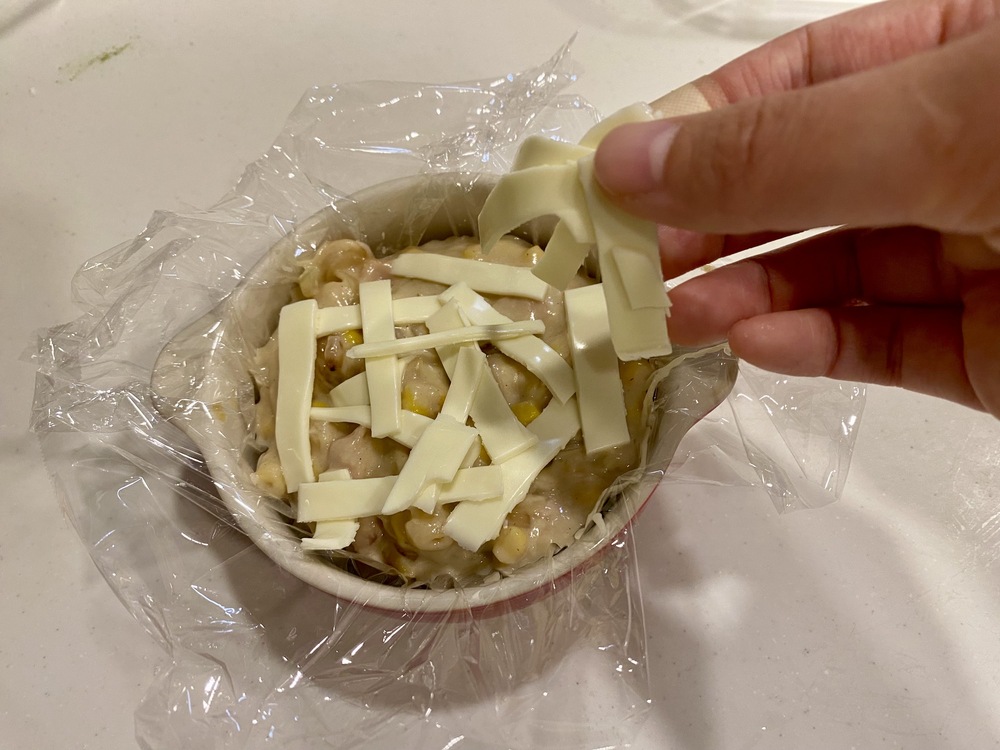 1.耐熱皿にラップを十字に大きめに敷き、粗熱が取れたグラタンを耐熱皿に入れ、最後にチーズを乗せる