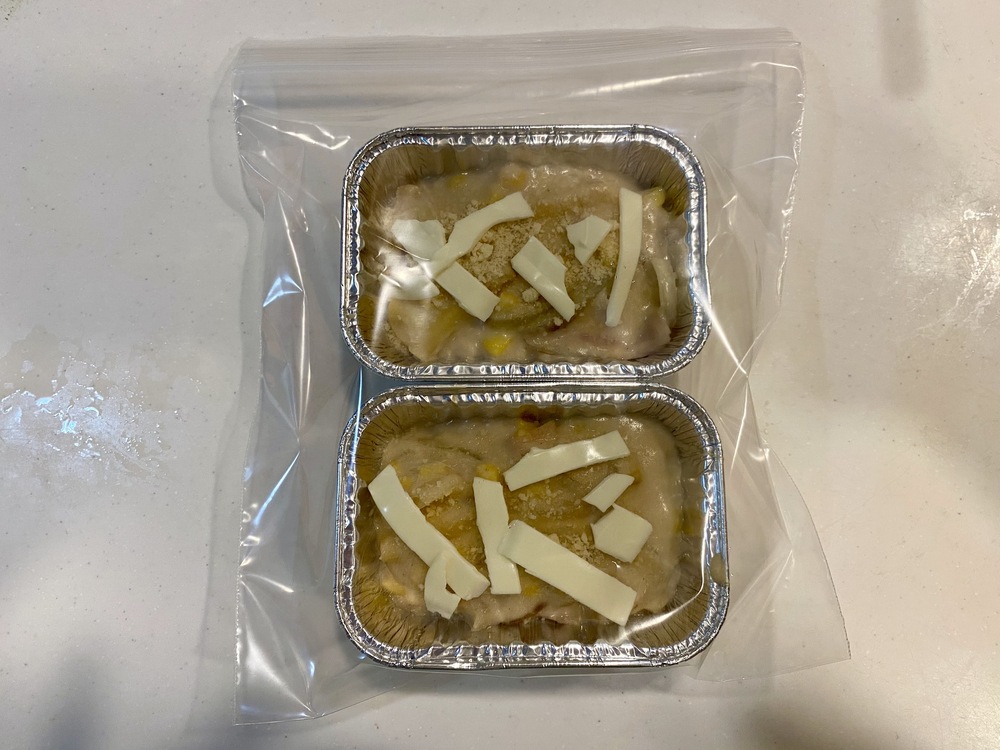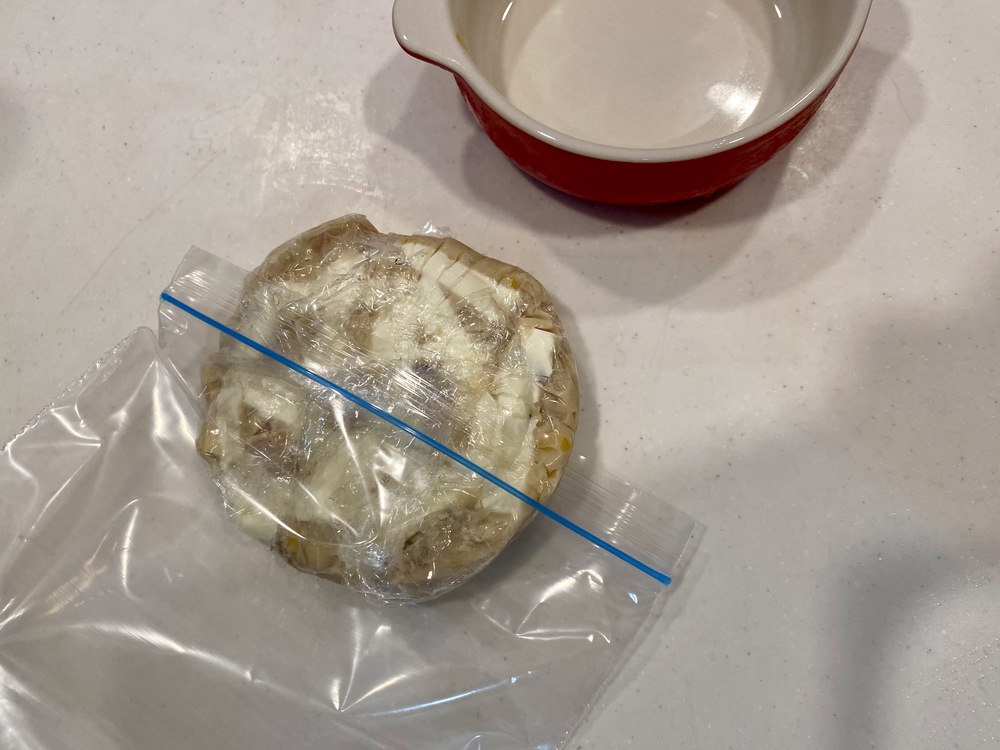 4.保存袋にラップで包んだグラタンを入れて、冷凍庫で保存する