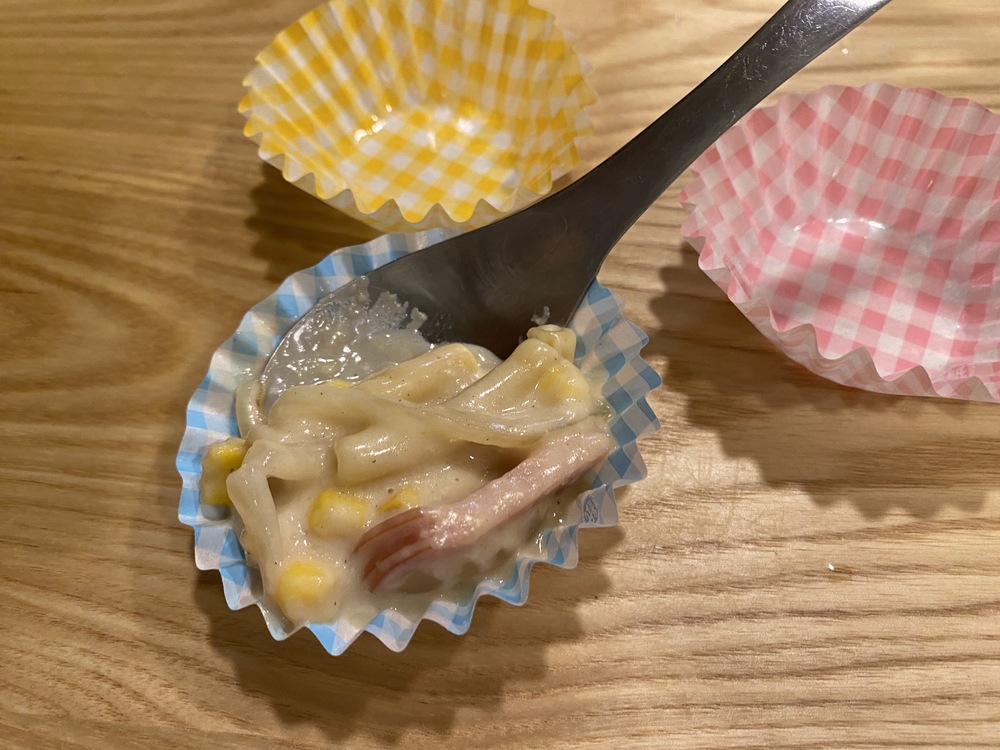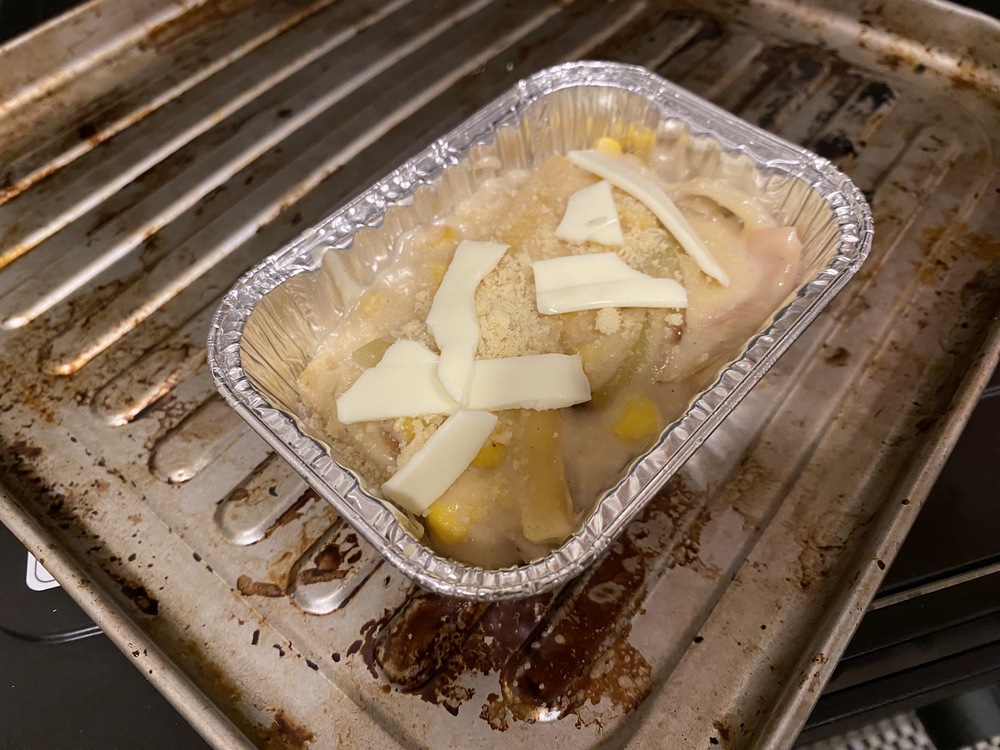 1.オーブントースターが可能なアルミカップやアルミ皿に、お弁当のために調理したグラタンを入れる