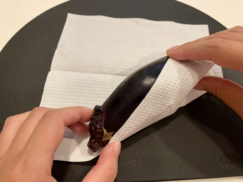 3.なすをペーパータオルで包み、水気をよく拭き取る