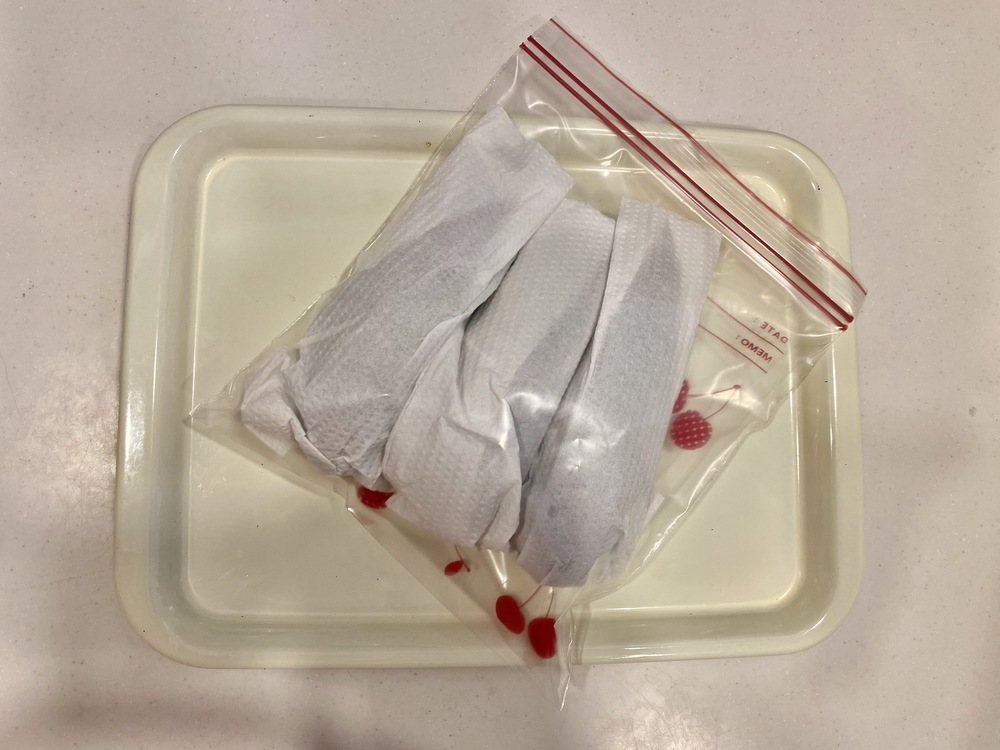 2.ザルに移して水気を切ってから軽く拭き取り、保存袋に入れる