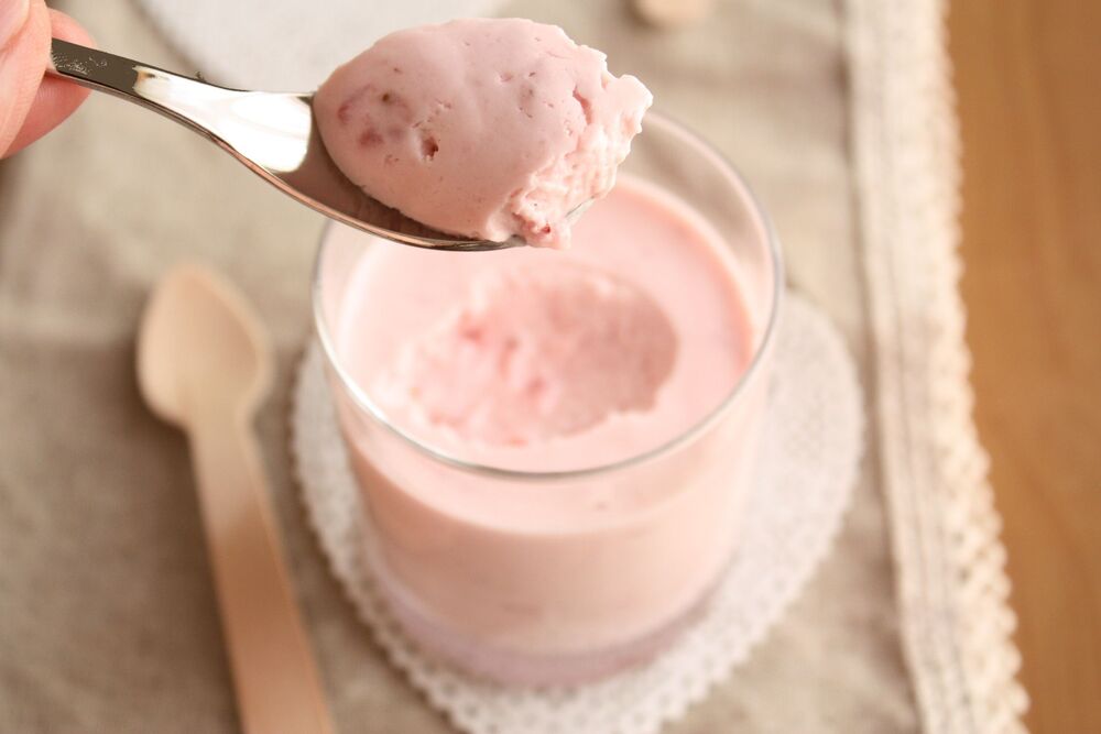 加熱に使うのは電子レンジのみで、冷凍いちごは柔らかく、泡立て器で簡単に潰しやすく調理が簡単なレシピです。いちごとマシュマロの甘みがあり、ホイップした生クリームで軽やかな食感になります。