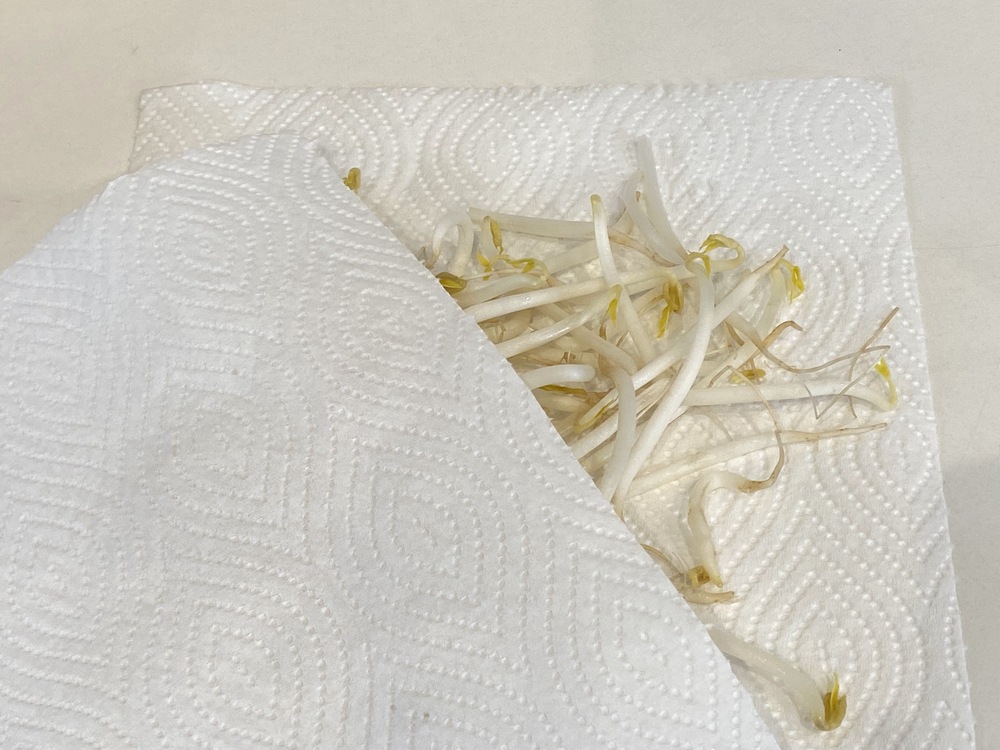 2.洗ったもやしの水気をしっかり切る