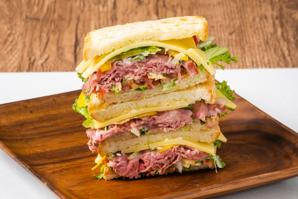ローストビーフをたっぷり使ったボリューム満点の一品です。食パンの代わりにバゲットやカンパーニュを使えば、また違った味わいや食感を楽しめるでしょう。さらに、玉ねぎの代わりに焼きナスやズッキーニを加えても美味しく仕上がります。