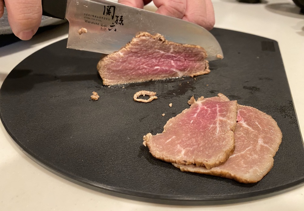 3.冷凍ローストビーフは半解凍の状態で薄くスライスする