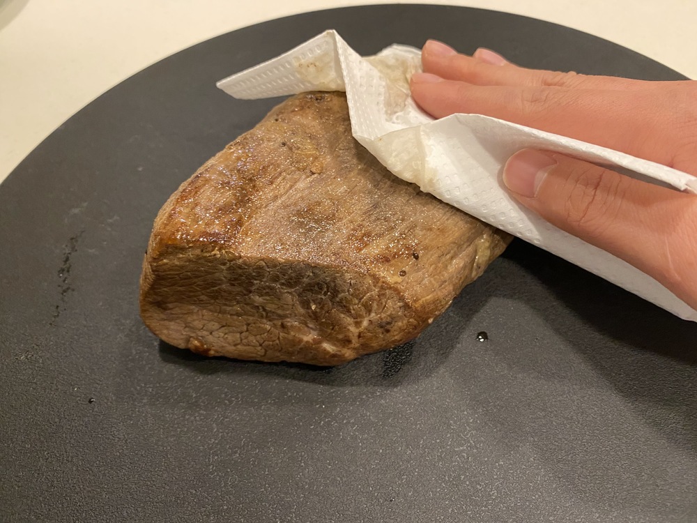 ローストビーフは表面に水分が付いたまま冷凍すると、解凍時に水っぽくなって風味が落ちたり、臭いの原因になったりすることがあります。キッチンペーパーでしっかり水分を拭き取っておきましょう。