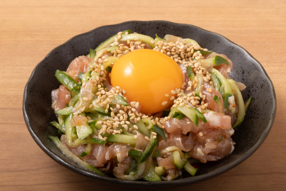 具材と調味料を混ぜ合わせるだけで作れる、生ハムに一工夫加えた一品です。お酒のお供としてだけでなく、ご飯にもよく合います。卵黄の代わりに温泉卵をのせても、美味しく楽しめるでしょう。