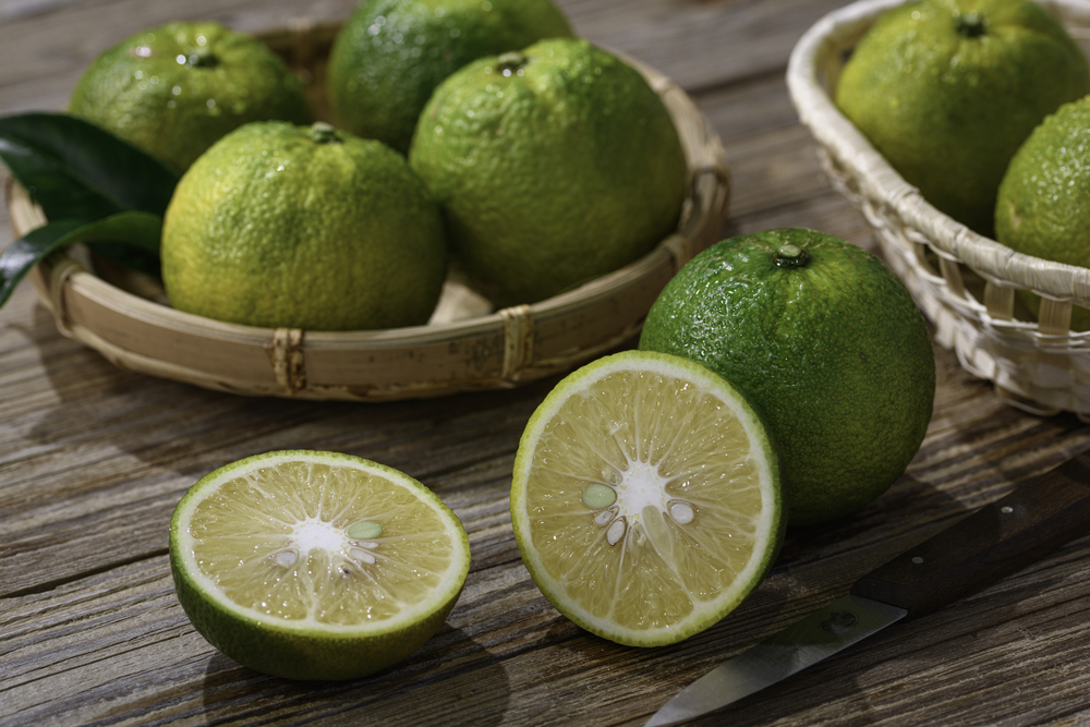 じゃばらは11月頃の収穫初期には果皮が緑がかっていますが、成熟が進むにつれて黄色へと変化していきます。非常に強い酸味と、わずかに感じる苦みが特徴で、生のまま食べるには向いていません。ポン酢や調味料、マーマレードなどの加工品として利用される柑橘です。