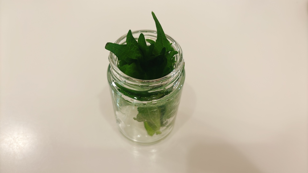 大葉は、瓶などの細長い容器を使えば、簡単に長持ちさせられます。大葉の茎はできるだけ長く残るようにカットし、瓶に入れる水の量は、葉が傷まないように茎のみが浸かる程度に調整してください。また、保存できる期間を延ばすためにも、瓶の水は2~4日に1回は取り替えることが重要です。