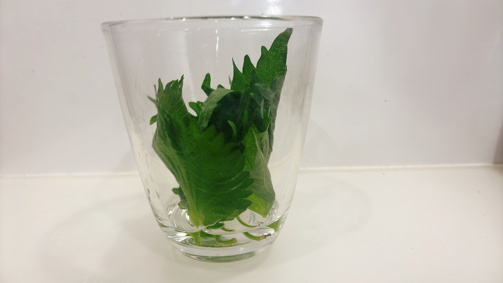 1.茎をカットしたら、水の入ったコップに大葉を入れる