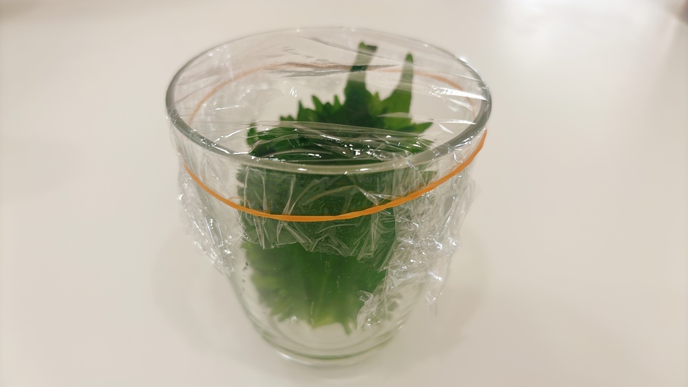 瓶がない場合は、コップを使っても日持ちさせられます。ラップをかけることで葉の水分が保たれ、乾燥を防げます。また、輪ゴムがない場合はラップだけでも構いませんが、鮮度を保つためにコップの水は1~2日ごとに取り替えるようにしましょう。