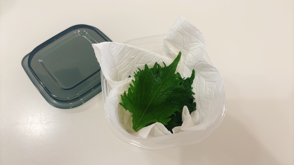 2.大葉をキッチンペーパーで包み、蓋をして冷蔵庫で保存する