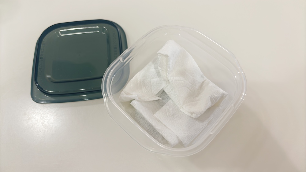 キッチンペーパーは大葉の乾燥を防ぎつつ余分な水分を吸収する役割があり、使用しないと容器内に水が溜まり、大葉が傷みやすくなってしまいます。また、大葉は複数枚重ねて保存しても問題ありませんが、キッチンペーパーが乾燥した場合は霧吹きなどで軽く湿らせましょう。
