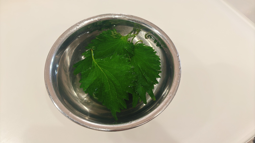 1.ボウルに水を入れ、大葉の茎を持ってふり洗う