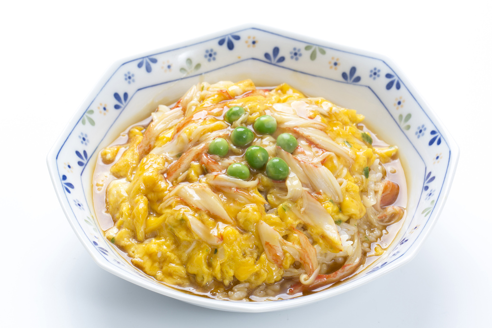 7.カニカマとグリーンピースを加え、卵を乗せたご飯に乗せたら完成