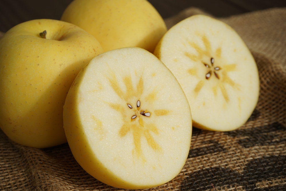 シナノゴールドは、黄金色の果皮と引き締まった果肉が特徴です。歯ごたえのある食感と、程良い酸味により引き立てられる甘味が持ち味で、爽やかな甘さの中に柑橘を思わせる風味が広がります。