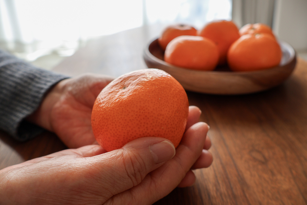 みかん選びで意識したいのが、手に取ったときの重さです。果肉の中に豊富な果汁が含まれている物ほど重量があります。一方、軽いみかんは中が乾き気味だったり、実が締まっていなかったりする場合があります。みかんは糖分が多いほど重くなるので、重みのある物を選ぶと良いでしょう。