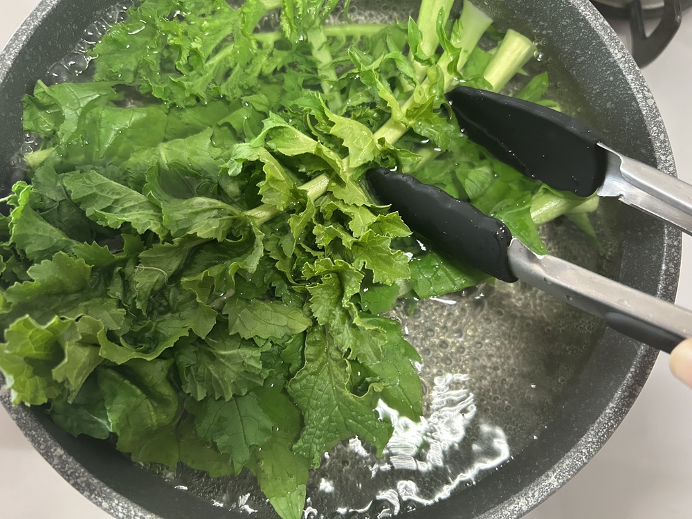 1.大根の葉を洗い、鍋に1Lの水と塩小さじ1を入れ、1~2分下茹でする