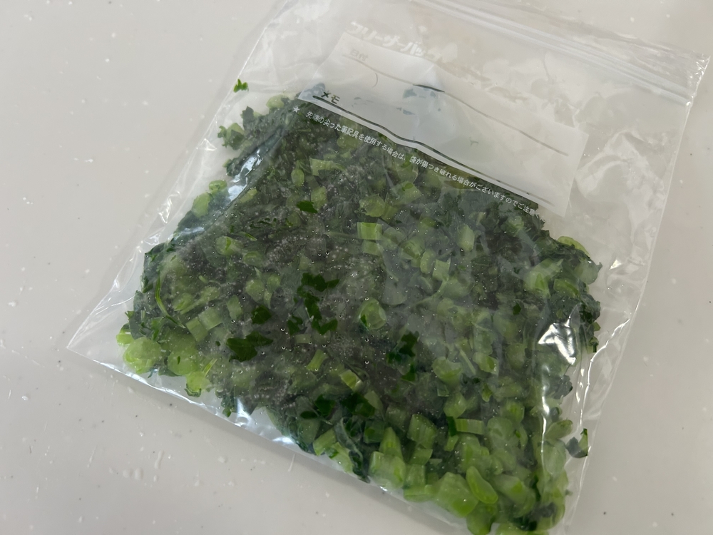 大根の葉は加熱によって酵素の働きが抑えられ、変色や青臭さが出にくくなるので、下茹でしてから冷凍するのがおすすめの保存方法です。霜を防ぎ、食感を維持するためにも、しっかり水気は切りましょう。また、切った大根の葉を袋内で薄く広げて早く凍らせることで、冷凍焼けを防ぎやすくなります。