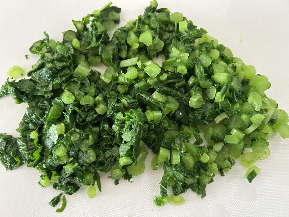 1.冷凍大根の葉を軽く解凍し、水分を絞って細かく刻む