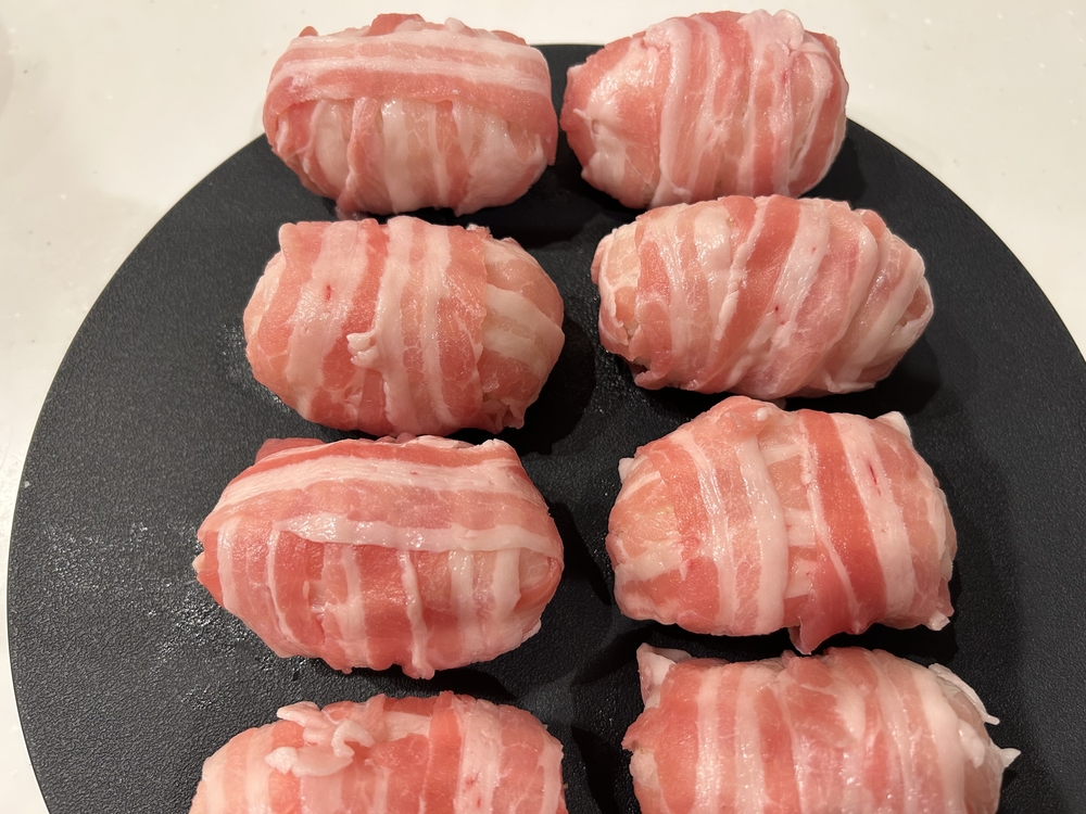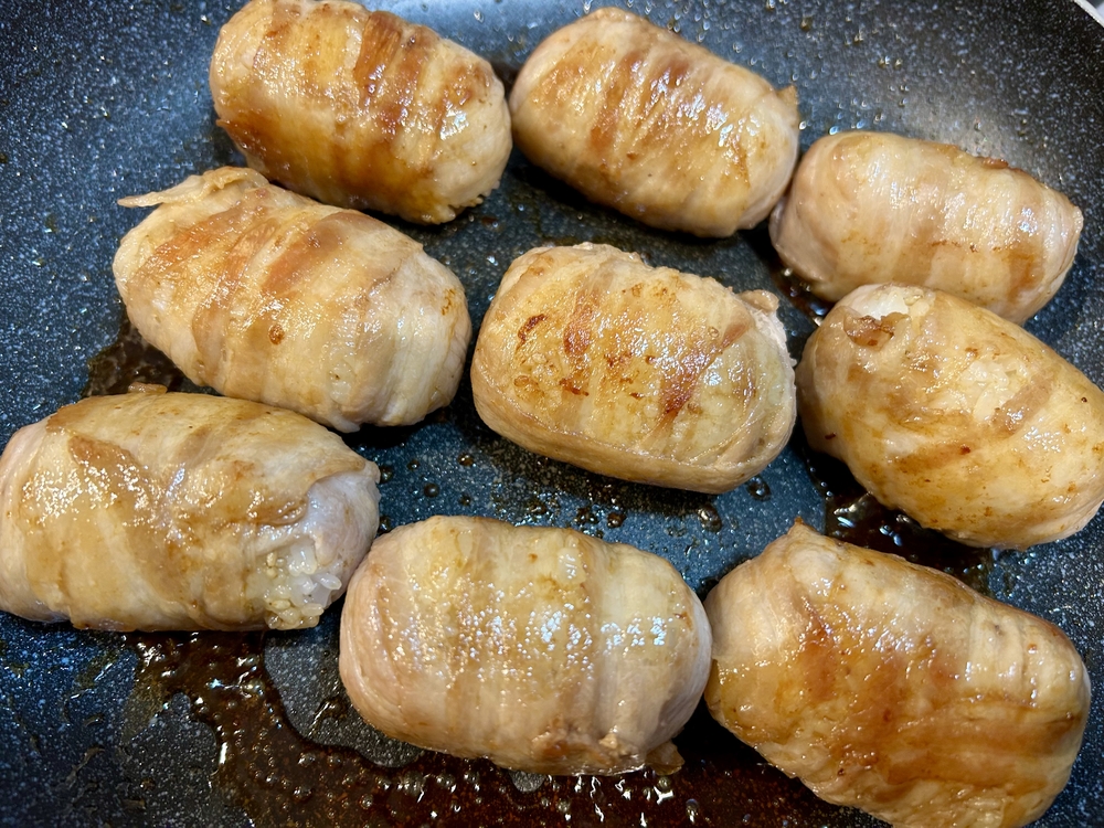 2.ごはんを小ぶりの俵形に成形し、豚肉を巻く