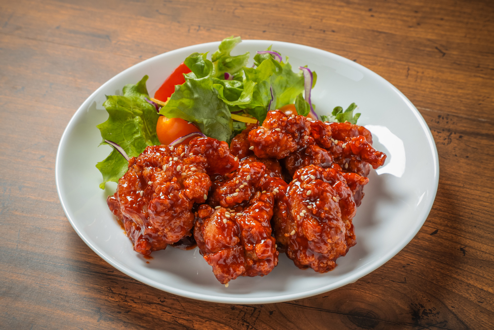 色鮮やかな見た目が食欲を刺激するヤンニョムチキンです。鶏肉を焼いた後にフライパンに残った油は、残っているとタレの食感が悪くなるので、十分に拭き取ってください。火が強過ぎるとタレを煮絡める際に焦げ付くので、火加減は弱めの中火にするのがコツです。