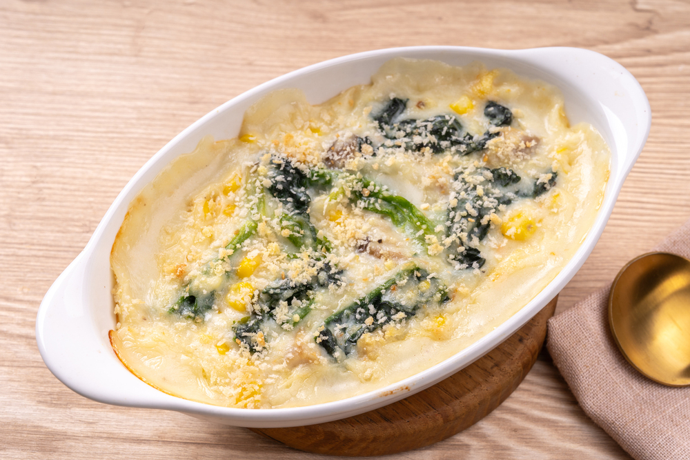 食事にもおつまみにもなる鶏肉とほうれん草のグラタンです。カボチャをプラスするなどのアレンジも楽しめます。小麦粉を加えた後は、粉っぽさがなくなるまで十分に馴染ませるのがコツです。
