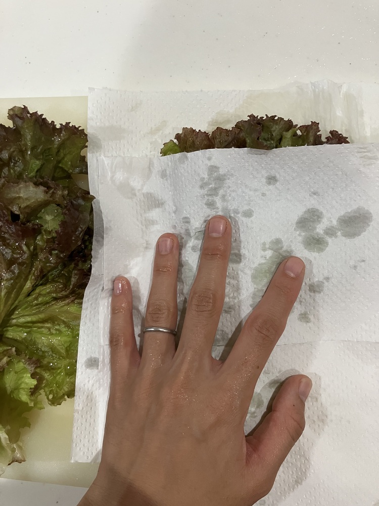 2.キッチンペーパーでサニーレタスを挟み、水分を拭う