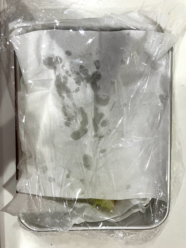 3.湿ったキッチンペーパーを上にのせ、バット全体をラップで密閉して冷蔵庫に入れる