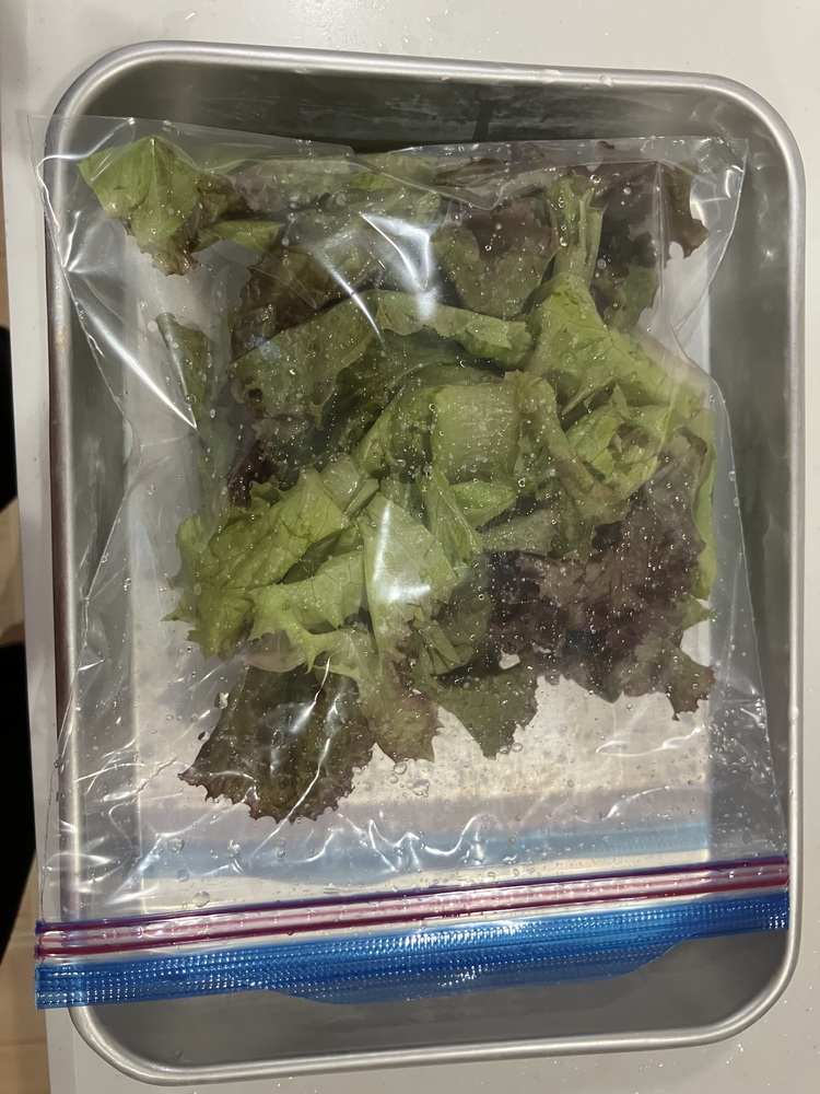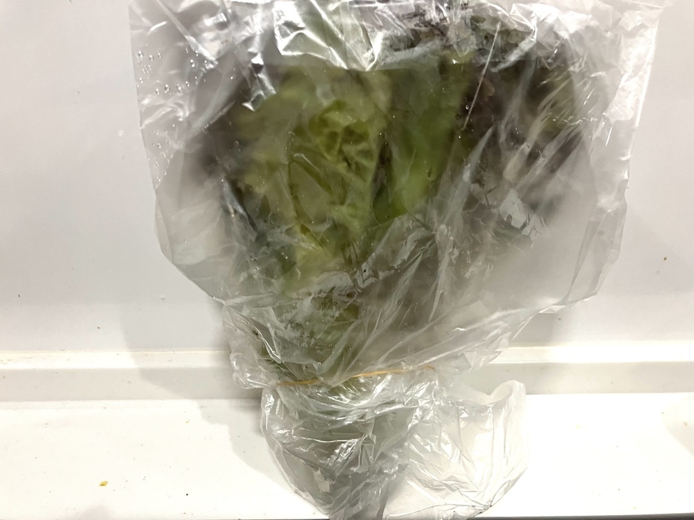 3.ポリ袋をサニーレタス全体に被せて、輪ゴムで留め、容器を冷蔵庫に入れる