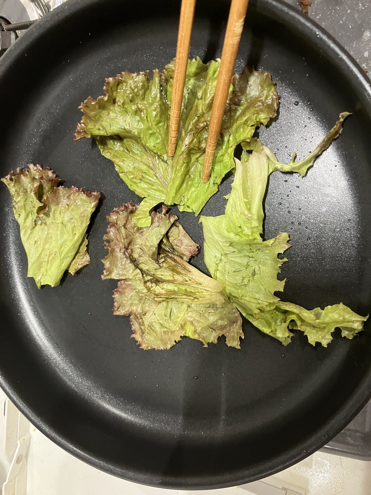 3.同じフライパンに冷凍サニーレタス、醤油、バターを入れ中火で加熱して、レタスがしんなりしてきたら火を消す