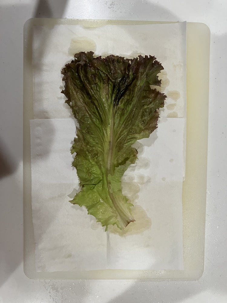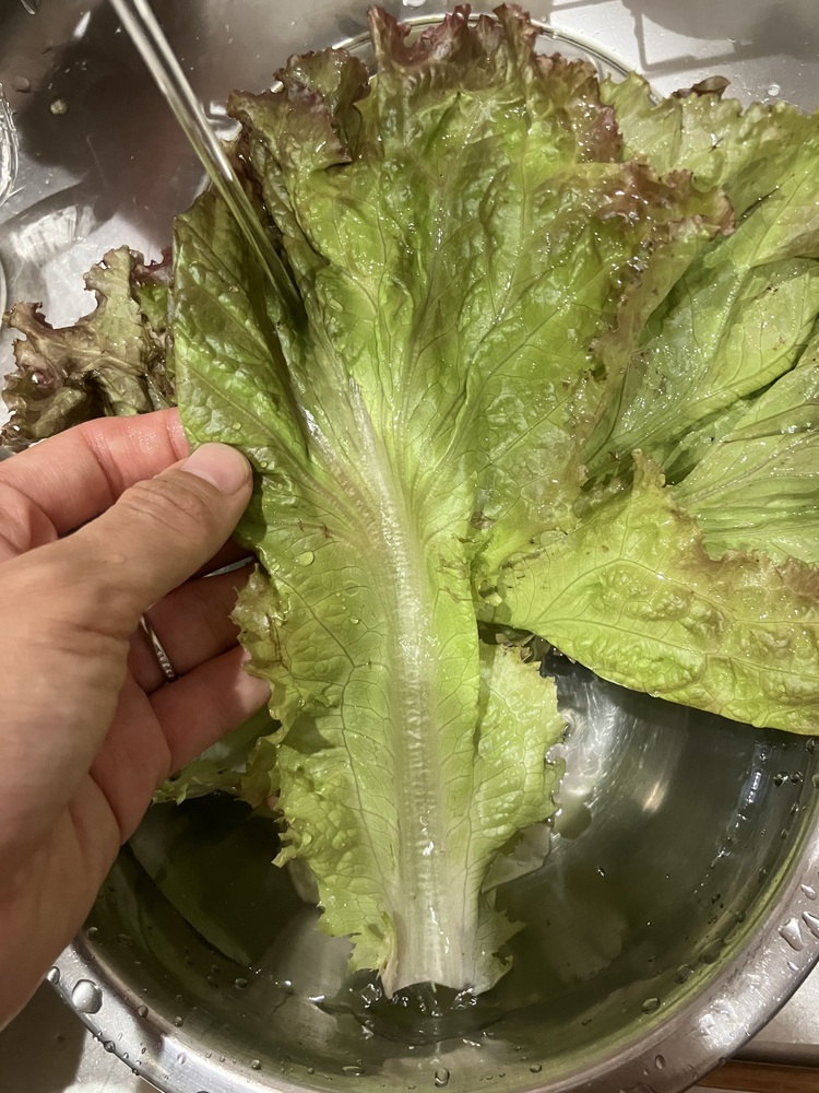 1.サニーレタスは完全に芯をカットして、葉を1枚ずつ丁寧に水で洗い、水分を拭う
