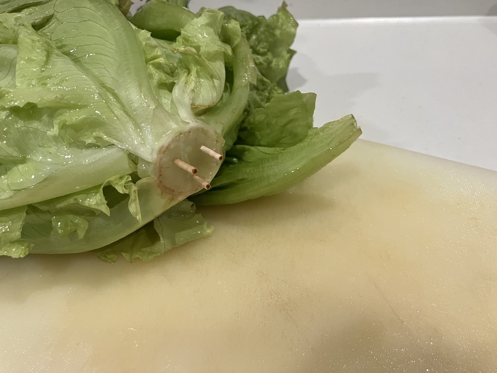 丸ごとのサニーレタスを冷蔵するのに爪楊枝を刺す方法があり、2週間ほど日持ちします。サニーレタスの芯には収穫後でも成長しようとする成長点が存在し、爪楊枝を芯に刺すとこれが壊れて成育が終わり、しおれるのを防ぎます。爪楊枝の本数は、レタスの大きさにより調整しましょう。