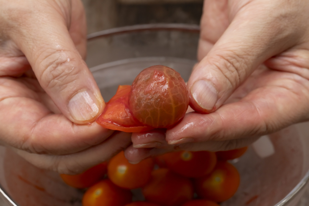 1.凍ったままのミニトマトを水に入れ、皮を剥く