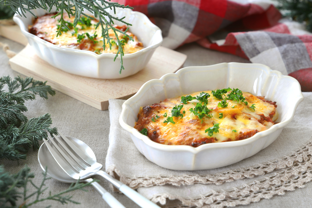 焼き上がったミートグラタンにパセリを散らすと彩りがよくなります。お弁当用に作りたい場合は、アルミカップにのせて焼いてください。