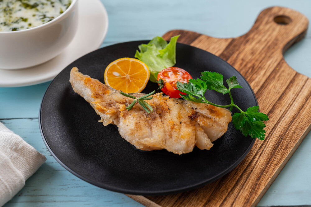 淡白な味わいの白身魚と、バター醤油の濃厚さが合う一皿です。レモンの輪切りやハーブを添えると、より爽やかな味わいになります。
