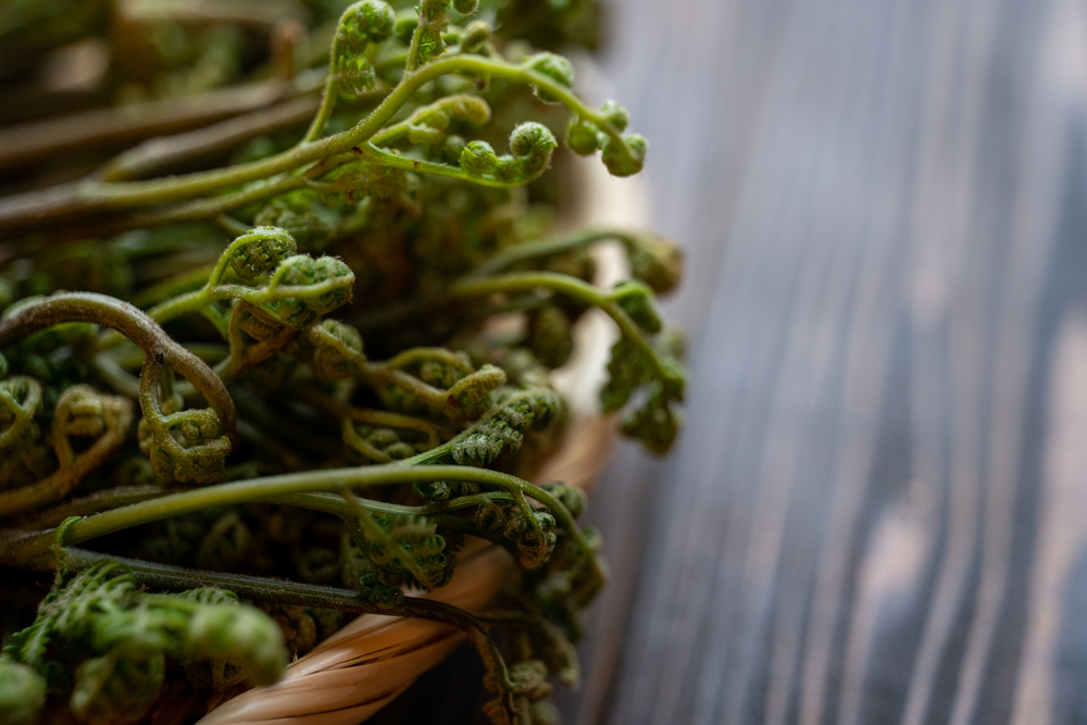 わらびは2月~6月が旬ですが、5月頃が最盛期です。主に山形県、茨城県、栃木県で収穫されています。日本では昔から春が旬の山菜として食べられてきました。先端の丸まった部分は柔らかく、食用とされています。