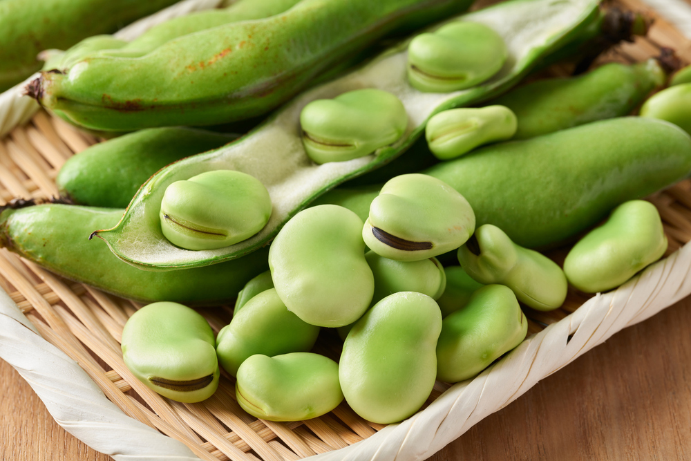 そら豆は大豆のように植物性タンパク質が豊富に含まれています。他にも体内のナトリウムを排出するカリウムや、苛立ちの解消効果が期待できるマグネシウムも豊富です。そら豆に含まれるビタミンCは、風邪予防や肌荒れの予防効果があります。茹でたり、トースターやフライパンでサヤごと焼いたりするのが定番の食べ方です。