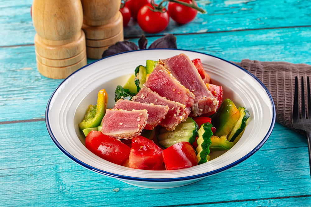 7.マグロを食べやすいサイズにスライスし、野菜と一緒に盛り付ける