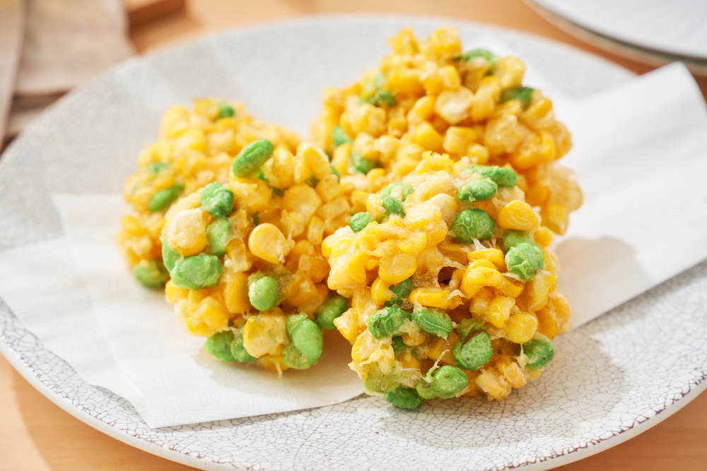 揚げることで、とうもろこしや枝豆の野菜の甘みが引き立ちます。どちらも解凍後そのまま加熱せずに食べられる食材なので、揚げ時間は短時間で済みます。