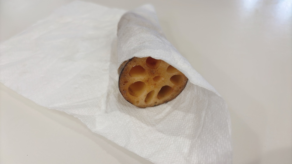 1.湿らせた新聞紙やキッチンペーパーでれんこんを包む